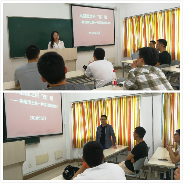 5月2日下午,理学院在学院院楼547教室举办了“凤回巢”校友分享交流主题活动,本次围绕“凤回巢之听‘理’说——物理博士是一种怎样的体验?”主题展开,特别邀请了两位理学院2012级应用物理专业本科毕业生作为嘉宾,为理学院2015级应用物理专业的同学讲述攻读更高学位的生涯规划及技巧。