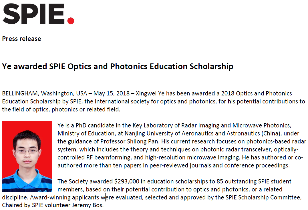 近日,2018年度国际光学工程学会光学与光子学教育奖学金(SPIE Optics & Photonics Education Scholarship)评选结果揭晓,我校雷达成像与微波光子技术教育部重点实验室在读博士生叶星炜同学荣获该奖项。此次奖学金共授予85位获奖者,其中国内仅有两个人获奖,分别是清华大学的郭强(音)和南京航空航天大学的叶星炜。