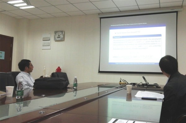2018年05月23日上午,IEEEFellow应浩教授于当日上午在将军路校区自动化学院1号楼405会议室与学院部分博士生开展了学术研讨会,并于当日下午在403会议室做题为“Type-2 Fuzzy Control vs Type-1 Fuzzy Control: An AnalyticalPerspective”的学术报告。会议由自动化学院院长姜斌教授主持,自动化学院部分师生参加了报告会。