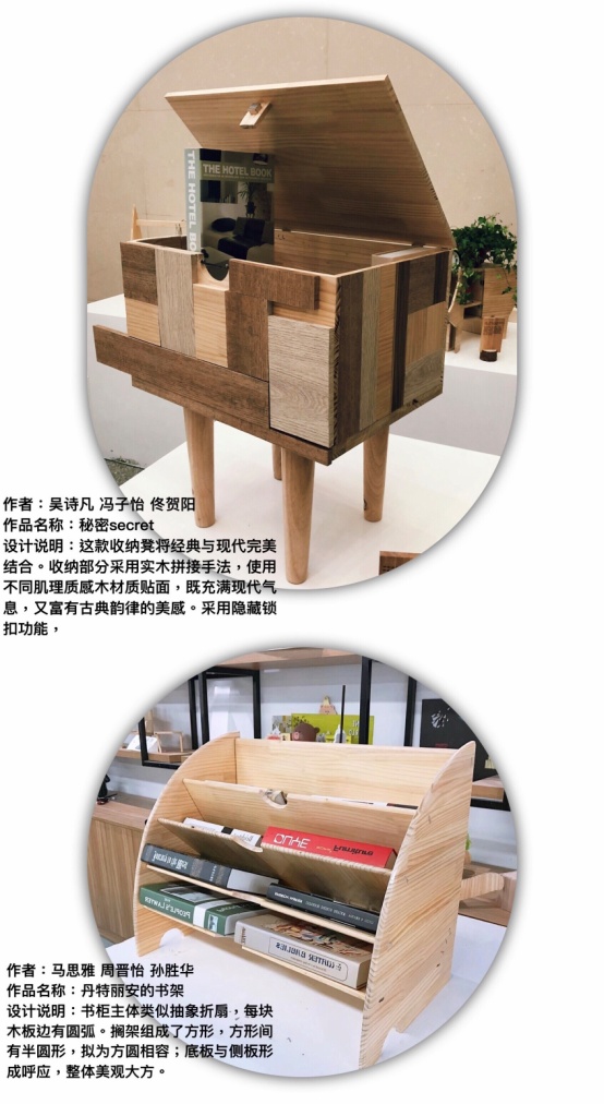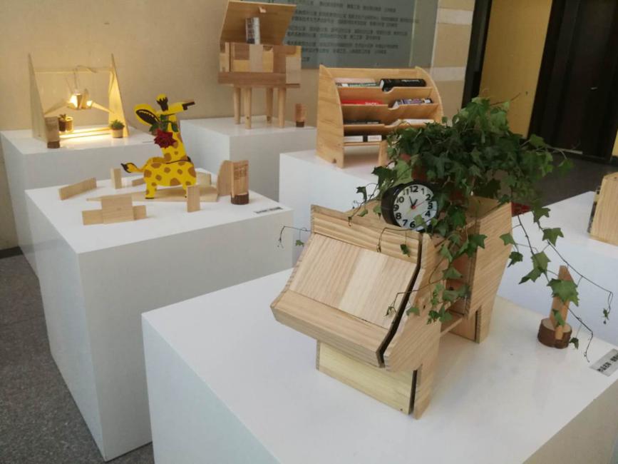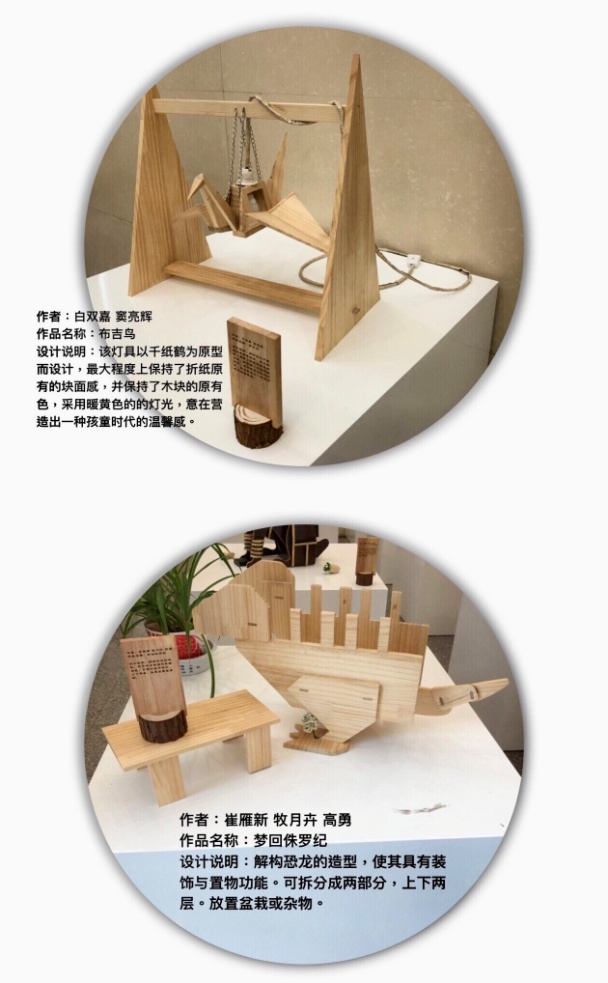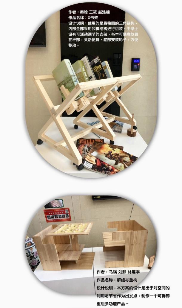 此次展览的12件作品,从构思、加工、展出,经历了草图绘制、CAD尺寸敲定、3Ds Max模型制作、最终的木材加工拼装与展示的几个环节,每个环节都不同程度地体现着环境设计专业课程的相关教学内容。而木材的放线、切割,再进行打磨、开榫及细节调整,最后刷漆上胶固定和艺术加工的流程,不但训练了学生们的动手能力,也是工匠精神的一次体现。举办展览的初衷,旨在通过作品的展示来探讨设计类实训课程教学内容设计,了解木工加工工艺技艺,以寻求更完美的教学理念与教学方法。