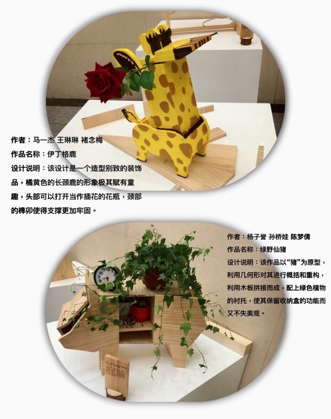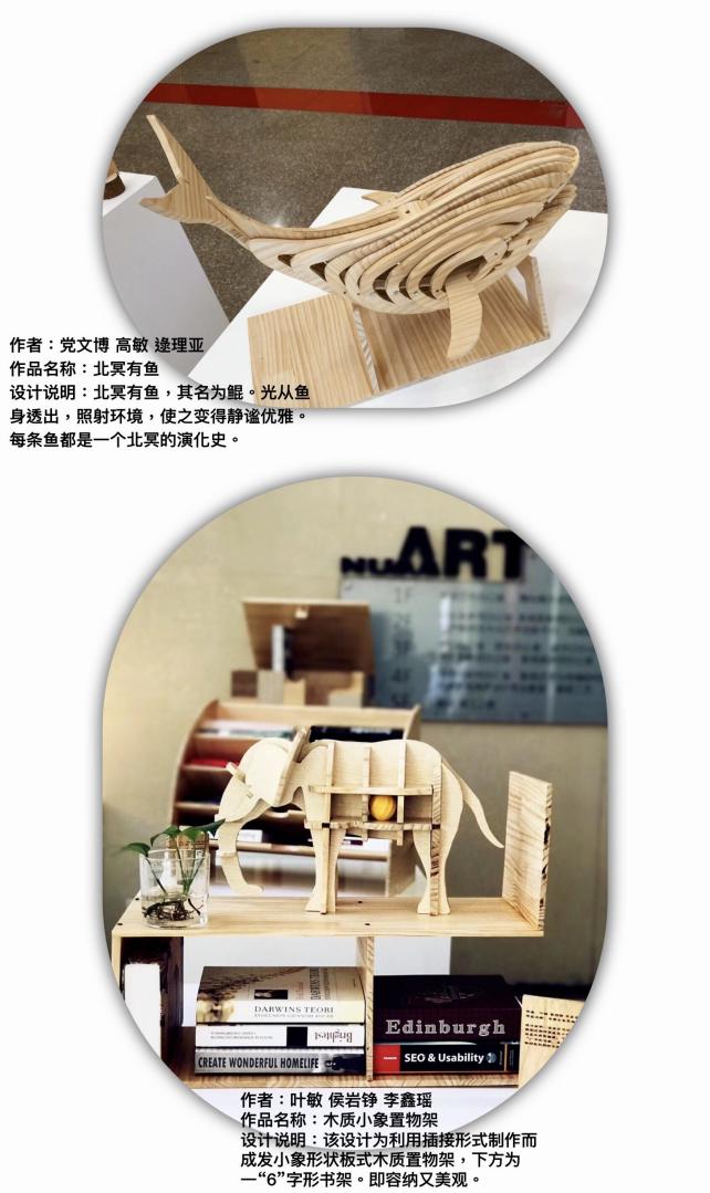 此次展出的作品,是在专业教师的精心指导下完成。老师根据实际情况,制定了针对性的教学计划:费斯托(FESTOOL)木工加工系统应用培训+创意或实用功能的板式家居设计呈现。课程的设计思路为利用自然界中动植物体态特征作为创意来源,然后进行几何造型重塑,改变具象形态尺度关系,概括结构层次,并使得造型更为夸张。设计过程中,学生需要确定陈设品的功能定位,并在此基础上进行功能分析与设计、结构设计、造型设计、工艺流程设计与制作流程优化设计的几个环节。