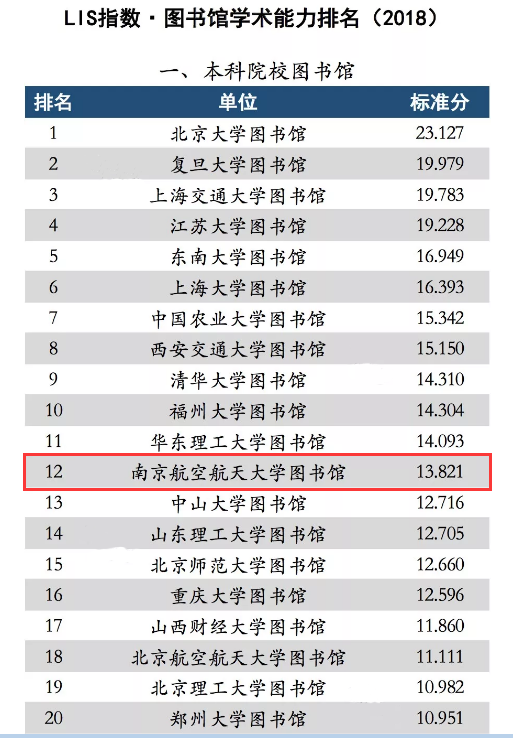 在刚刚公布的LIS指数之2018图书馆学术能力排名中,我校图书馆位居本科院校图书馆第12位,工信部部属高校中第1位,该排名展示了我国大陆各类型图书馆的学术能力。