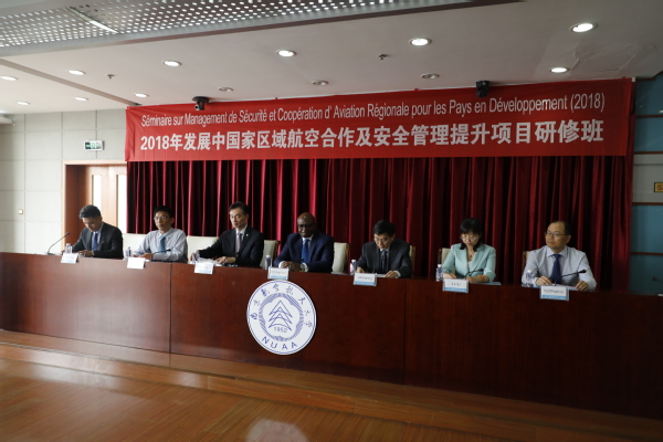 刚果(布)代表团、中航国际相关领导、副校长施大宁、民航学院相关领导出席开班仪式。仪式由国际合作处副处长陈峰主持。