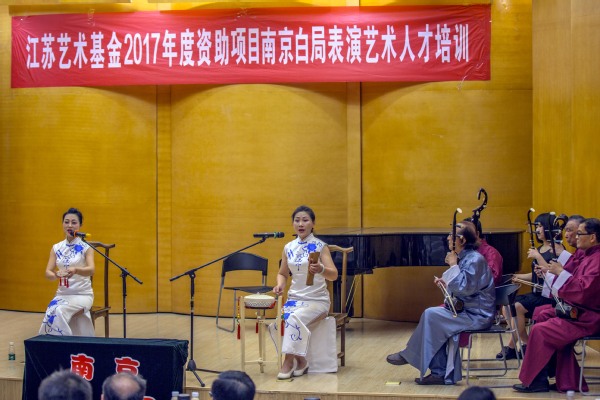 经过为期半年多的集中培训和分组辅导,南京白局表演艺术人才培训已完成所有培训任务,进入结项验收阶段,本次汇报音乐会是该项目结项的内容之一。为认真负责、高质量地做好此次培训项目,项目负责人板俊荣教授全程参与了培训工作,在理论讲授的同时,严格把控了集中培训阶段的课程进程和培训内容。项目邀请了马敬华、周慧琴、黄玲玲、高小玲四位省级传承人作为培训教师,她们四位曾在上世纪60-90年代将白局的舞台表演及歌唱艺术推向了高峰。接受培训的学员来自南京白局市级、区级传承人和白局爱好者,以及我校艺术学院音乐学方向的研究生,江苏省第二师范学院和南京晓庄学院的音乐学专业本科生,总计26名。培训期间学习了南京白局所有经典唱段和表演技艺,在高小玲老师的努力下,恢复了几近绝响的经典剧目《上寿全词》各唱段。