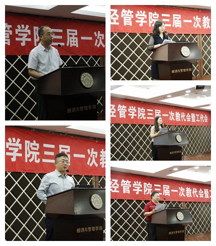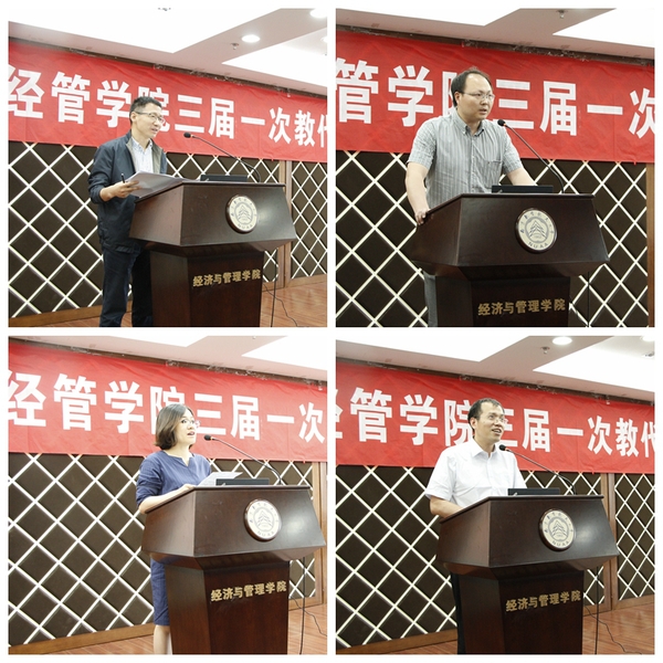 随后学院院长周德群做《经管学院综合改革方案》的工作报告,周德群从学院发展现状、面临的突出问题、综改指导思想与目标、具体举措、制度保障等方面对做了详细而深入的阐述。之后,院第二届工会主席沈辉代表学院工会做总结报告,并投票选举产生了经管学院第三届部门工会委员。随后,学院教师代表分成四个代表团分别对学院综合改革方案进行了热烈的讨论,各代表团团长分别将讨论意见向大会代表做了汇报,与会教师代表审议通过了工作报告。最后,主持人公布了新一届学院工会委员当选名单,并由任慈当选委员做了提案征集报告,学院副院长邓晶做了总结发言。