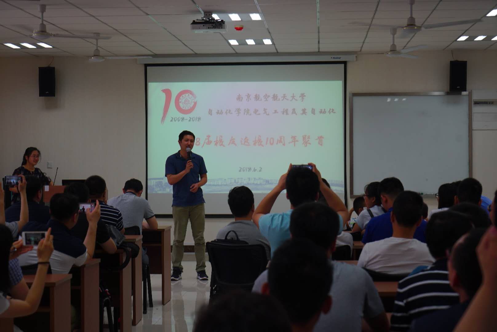 此次见面会由自动化学院刘斐文老师主持,院党委副书记张跃代表三院欢迎各位校友回家,感谢校友们返回母校,重温校史,再叙友情; 随后,当年04级的辅导员,现校团委副书记丁琛老师上台讲话时,全场的气氛达到了高潮,"我今天在这里可就不是在召开年级大会了啊。"——丁琛老师一开口就逗笑了台下各位,笑中又感慨良多,回不去的是旧时光,但所幸,十年光阴,大家又坐在了这里,未忘初心。"你们中有很多人成为了非常优秀的工程师,也有留校任职的,都非常优秀 "提到大家的现在,丁老师不无骄傲地为当年的学生感到高兴。大屏幕播放着南航自动化与时俱进的发展,"从前你以母校为荣 现在母校以你为荣",这些发展和进步也都离不开从南航走出去的校友。