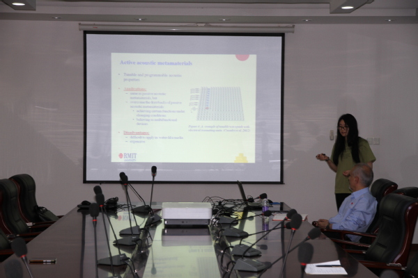 Akbar Khatibi教授的报告介绍了在多功能复合材料领域的最新进展,通过在传统复合材料中集成入微密封的相变材料使之具有热管理功能,实验研究给出了不同组份的相变材料对复合材料多种力学性能的影响。赵静雯的报告介绍了在声学超材料领域的最新进展,采用数值方法对水状介质中具有非周期性、非线性结构的声学超材料进行了模拟以研究设计参数对其性能的影响。报告内容丰富、精彩生动,对我校相关科研工作具有借鉴作用。同时,Akbar Khatibi教授还结合自己多年的研究经历,与现场听众分享了多功能复合材料、声学超材料的研究心得和体会。裘进浩教授、孙慧玉教授、王婧副教授、严康副教授、蔡登安老师出席了报告会。