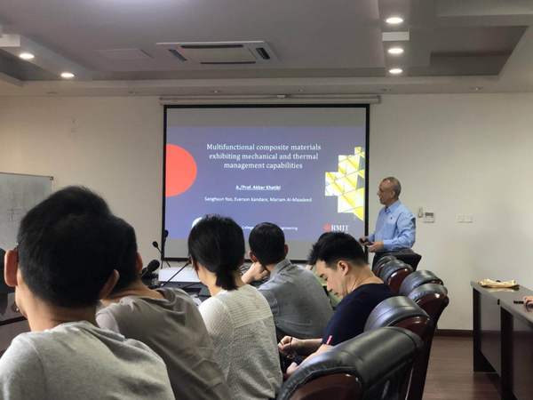 应我校航空宇航学院高存法教授的邀请,来自澳大利亚皇家墨尔本理工大学的副教授Akbar Khatibi携同他的博士生赵静雯于2018年6月2日访问了我校,并于6月7日早上分别为我校师生做了题为“Multifunctional Composite Materials Exhibiting Mechanical and Thermal Management Capabilities”、“Design and characterization of acoustic metamaterials in water-like media”的学术报告。