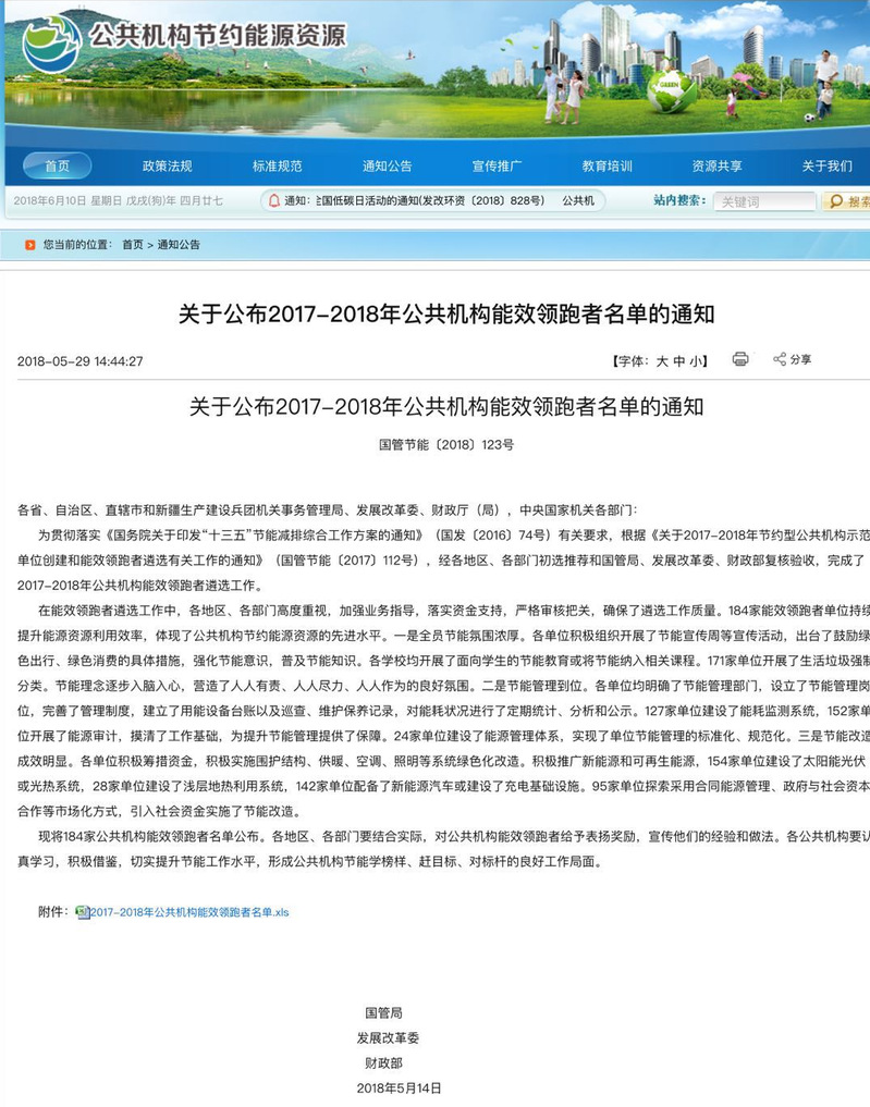 在2018年全国节能宣传周来临之际,国家机关事务管理局通过公共机构节约能源资源网公布了2017-2018年公共机构能效领跑者名单,我校荣获此项荣誉。成为为全国首批184家公共机构能效领跑者之一,这是继我校成为“节约型公共机构”以来获得的更高层次节能荣誉。