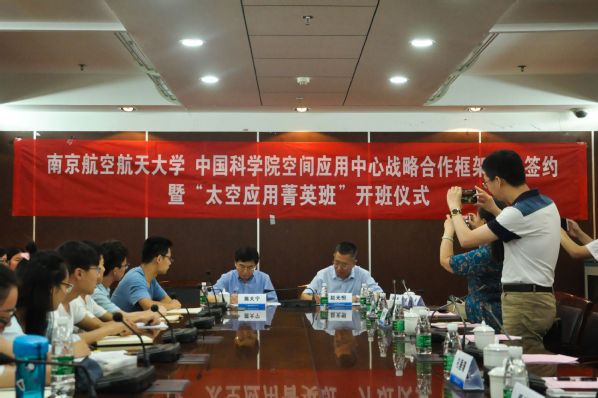 6月11日上午,我校与中国科学院空间应用中心战略合作框架协议签约暨“太空应用菁英班”开班仪式在将军路校区一号楼成功进行。此项工作由学校教务处精心指导协调,航天学院具体承办,自动化学院和计算机学院共同参与。中科院空间应用中心副主任、921工程空间应用系统总设计师、校友赵光恒,空间中心人事教育处处长颜廷锐,我校副校长施大宁、教务处处长孔垂谦、副处长梁文萍,航天学院党委书记季海群及相关学院负责人、首届“太空应用菁英班”全体学员出席了本次会议。