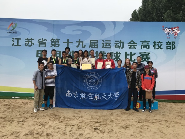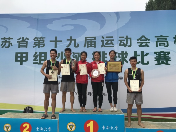 6月7日—10日,由江苏省教育厅、江苏省体育局主办,江苏省学生体协高校工作委员会协办,东南大学承办的江苏省第十九届运动会高校部甲组沙滩排球比赛在东南大学九龙湖校区举行。来自全省近二十三所高校的41支队伍参赛。比赛分设男、女高水平组和男、女普通生组两个组别。我校男女沙滩排球队在领队杜长亮、蒋晔和教练陈建杰老师的带领下参加了普通生组的比赛,最终获得男子普通生组第二名、女子普通生组第四名的好成绩。