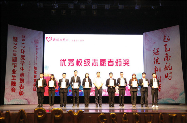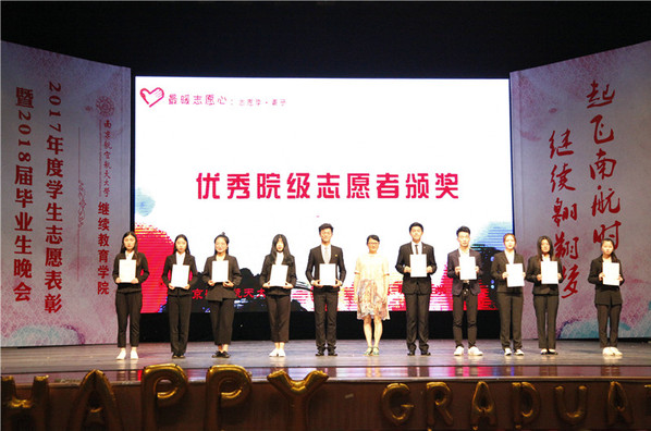 为了树立志愿典型、展现优秀毕业生风采,南京航空航天大学继续教育学院于2018年6月7日在新大学生活动中心举办了2017年度学生志愿表彰暨2018届毕业生晚会。院长杜传锋、院党委副书记贡海俊、党政办公室主任王勇、团委书记黄超峰、教师代表等参加了活动。