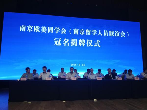 在随后召开的南京欧美同学会(南京留学人员联谊会)冠名揭牌仪式上,欧美同学会副会长夏颖奇致辞,他说,新时期欧美同学会是中国共产党领导下的人民团体,是党联系留学人员的桥梁纽带。希望大家能够团结一心、共同努力,为南京经济社会的建设发展做出新的更大贡献。