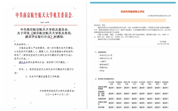 制定《南航机关作风建设评议暂行办法》,面向全校师生开展机关作风建设评议