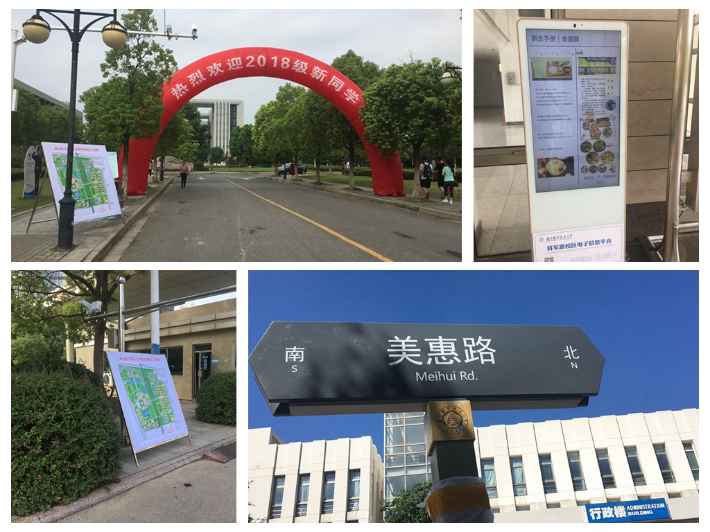 氛围营造,传播南航优秀文化。新学期开学和迎新期间,校区线上线下进行氛围营造,编写《2018将军路校区管理服务指南》,通过微信公众号发布《2018新生手册》系列推送,以迎新为主题进行校园环境布置,开通“将军路校区电子信息平台”,在行政楼、学生食堂、部分教学楼等多处进行迎新专题电子图文循环展播,严格审核和规范迎新宣传品内容,形成正能量的主流宣传氛围。同时,重新设计印制了校区手绘地图,安装了新的路牌,设置了多个网红“打卡点”,从整体布局和具体细节双向入手,体现学校用心、用情的管理服务文化。