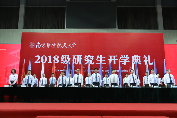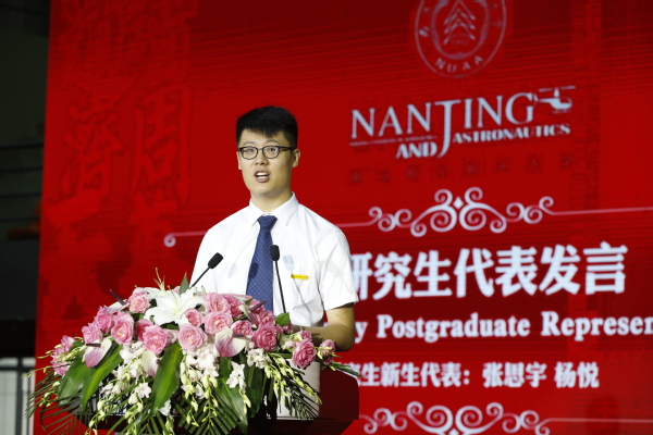 典礼开始,16个学院院旗依次入场,各学院领导致欢迎辞并寄语本学院新生,点燃了3639名研究生新生的青春热情。随后,航空宇航学院2018级直博生张思宇、能源与动力学院2018级直博生杨悦作为新生代表发言。两位同学表示,2018级研究生作为新时代南航发展的参与者、见证者和创造者,他们会珍惜学校提供的各类平台,勇于探索、敢于创新、逐梦云天,秉承“航空报国”的传统,遵循“团结、俭朴、唯实、创新”的优良校风,践行“智周万物,道济天下”的校训,在研究生学习阶段,在学术探索的道路上,把追求学问、创新奋进作为一种新生活方式,勇做担当民族复兴大任的时代新人。