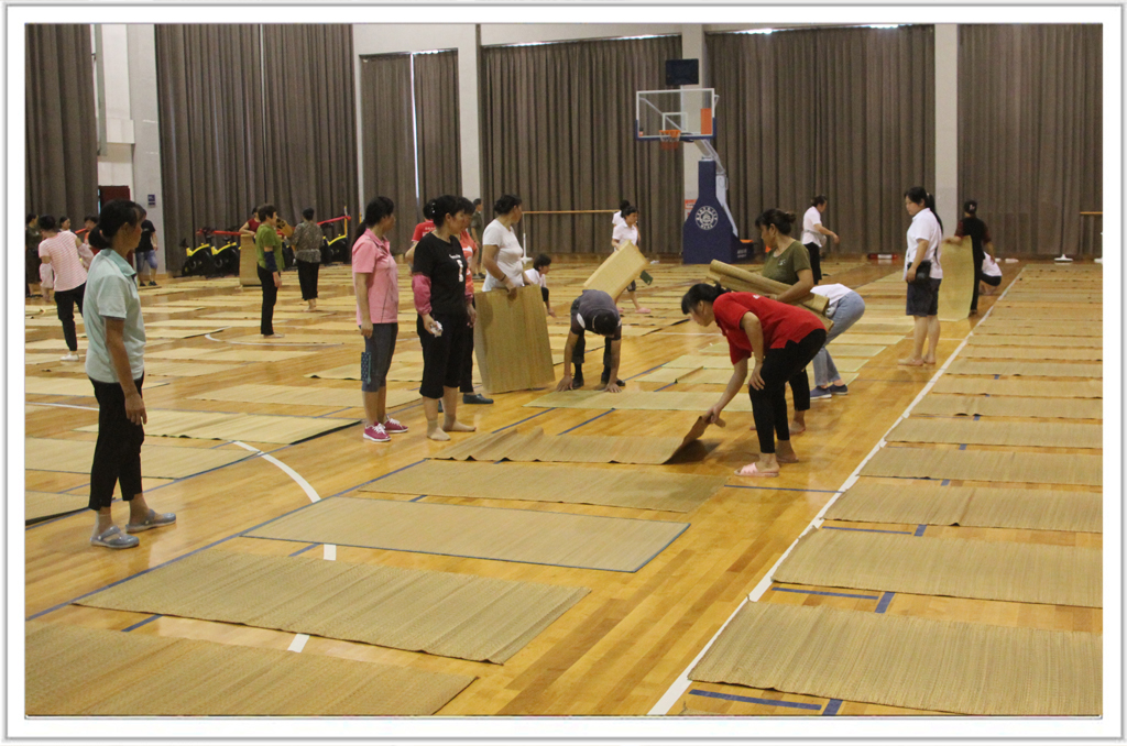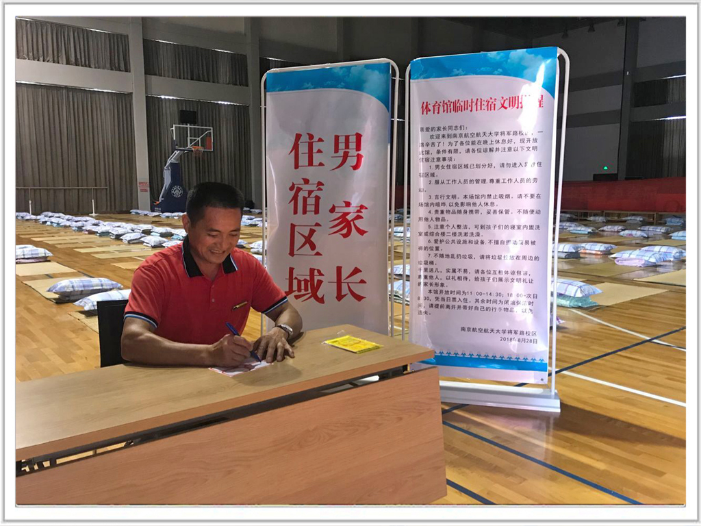 从8月14日起,百名公寓阿姨进入近2000间迎新宿舍、400多个套间的大厅和盥洗室进行打扫;阿姨们还用娇小的身体背起三十多斤的卧具包,一套套的放进每个新生的房间里,共计背送4000余套。8月的南京闷热潮湿,繁重的体力劳动让员工们疲惫不堪,但为了能尽快完成任务,员工们都咬牙坚持。迎新之前,学校周围宾馆已经爆满,为了解决新生家长住宿问题,公寓中心及时向校区管委会汇报情况,将体育馆的篮球场布置为新生家长临时免费住宿点。8月31日早晨,宿舍管理员就开始了紧锣密鼓的准备工作,铺草席、放置枕头、空调被,摆放提示牌,为家长创造了一个舒适的休息环境。