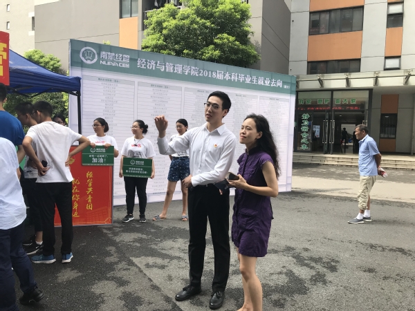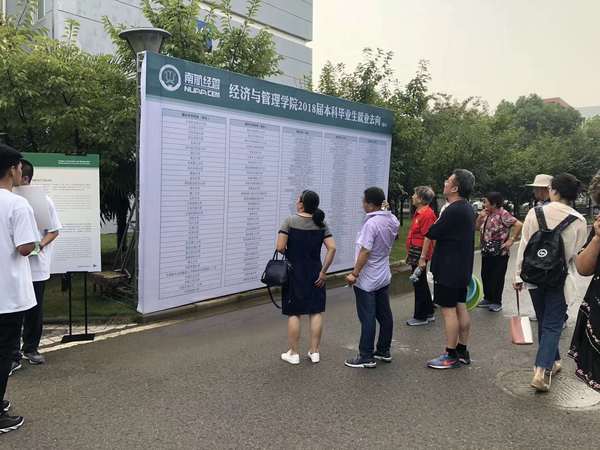 调研中,辅导员们了解到就业是绝大多数家长最关心的问题。为了让家长们了解我院的就业现状,学院在迎新报到现场设置经管学院18届毕业生的毕业去向大喷。国内升学、国外升学、就业等数据一目了然,志愿者还会对数据进行“深度讲解”,帮助经管新生树立稳固的专业自信心。