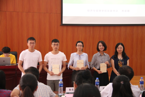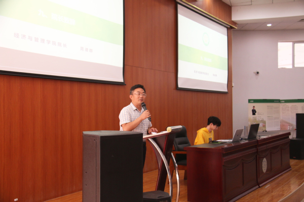 本科生新生尹佳怡代表新生发言,表达了对大学的向往;为帮助新生更快适应大学学习生活,学院为每个班级安排了高年级学导,王英和王子龙为学导们授发聘书;邓晶作为教师代表发言,表达了对2018级新生的殷切期望,祝愿每位同学在经管院都能学有所成;焦宏图代表学院赠予本科生新生代表《如何读大学》、研究生新生代表《乡土中国》,激励同学们能在大学里更加务实、更加专注,走好学习生涯的每一步;马静、谢嗣胜、袁潮清三位系主任依次以一句话寄语新生,并对即将开展的本科生、研究生系部见面会发出邀请;最后的院长致辞环节中,周德群再次与新生们互动:为什么读大学、为什么读研究生,周院长从回归兴趣、回归梦想、回归课堂、回归本质四个方面勉励新生们,不断明确目标、砥砺前行,选择自己所热爱的方向并为之奋斗。