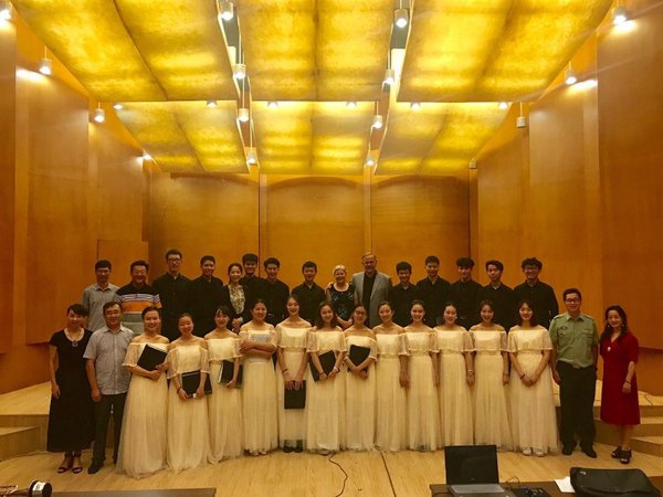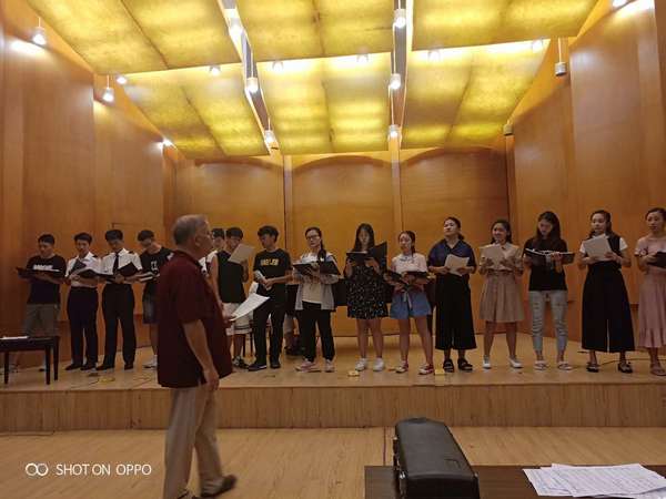 John教授在两周时间内为我校“鹰之歌”合唱团开展16课时的爵士合唱教学,并与音乐学研究生多次座谈,实质性地参与了板俊荣教授的课题研究。在两周紧张而生动的教学中,John教授为合唱团排练了四首国际上非常流行的爵士合唱作品,帮助合唱团员解决了爵士合唱的发声与节奏问题,给合唱团注入了新的演唱风格。为提升教学效果,John教授还邀请他的妻子Teresa教授做助教,全程为课堂教学和音乐会伴奏。