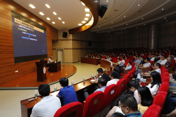 9月27日下午,我校召开教育思想大讨论专题辅导报告会。中国教育学会会长、“双一流”建设专家委员会委员、北京师范大学原校长钟秉林教授应邀来校作了题为《“双一流”建设与大学人才培养》的辅导报告。在校校领导、党委常委、校长助理,学院系所、专业负责人,教师代表,全体中层干部参加了报告会。报告会以视频直播形式同时在两校区举行。副校长施大宁主持了报告会。