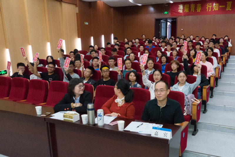 为扩大理学青年2018年暑期社会实践成果的辐射影响,用鲜活的故事为新生传递实践正能量,10月9日下午,“理耀青春,行知一夏”理学院2018年暑期社会实践师生“悦讲评”在将军路校区图书馆报告厅举行。理学院党委副书记方正、副教授朱小萌、江苏科技馆老师陈忻、理学院团委书记欧珊、各年级辅导员和学院一、二年级本科生参加了本次活动。