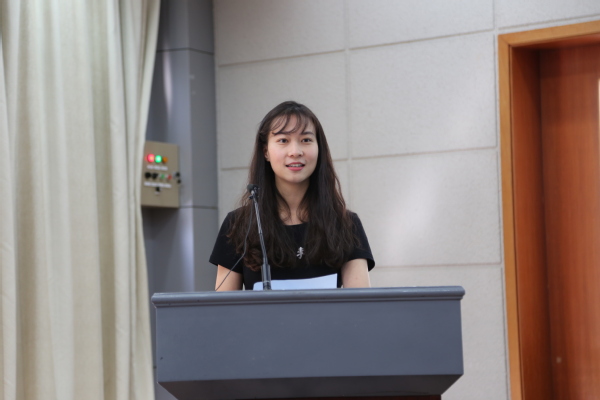 2017年校本培训优秀学员代表、2017年江苏省微课竞赛一等奖获得者,艺术学院李倩岚老师以《从心出发,向新而行》为题分享了她一年来的学习培训体会以及几位国家级教学名师带给她的教书育人启迪。
