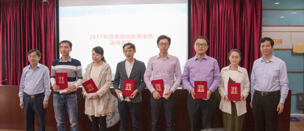 2017年教师发展与教学评估中心第一次承办教师岗前培训,共有73位教师参加校本培训,其中71名教师获得校本培训合格证书,20名教师获评优秀学员。郑永安和施大宁为优秀学员代表颁发了荣誉证书和智慧教学专用翻页器,期待他们在未来的智能教育时代,用心设计教学,用情感染学生,用爱推动“课堂革命”。