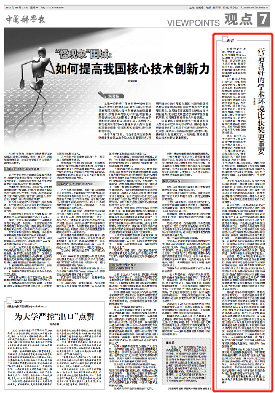 编者按:近期,《中国科学报》特邀我校机械结构力学及控制国家重点实验室主任熊克教授撰文,剖析近邻日本在诺贝尔奖方面取得突出成就的原因以及带来国内的启发。熊克教授文章《18年里18人获诺奖,好学术环境比获奖更重要》刊登在10月8日的科学网头条,10月22日《中国科学报》以《营造良好的学术环境比获奖更重要》为题刊发文章。