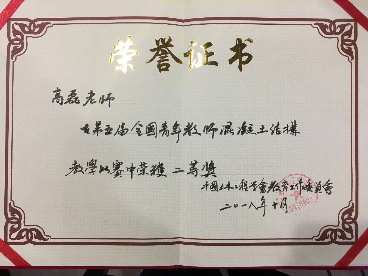 第五届全国青年教师混凝土结构教学比赛于2018年10月21日在古城西安落下帷幕。来自同济大学、哈尔滨工业大学、福州大学、河海大学、国防科技大学、中国矿业大学、陆军工程大学、郑州大学和长安大学等近40所高校的40余青年教师参加了比赛。经过激烈争夺,我校土木工程系高磊博士以总分第二荣获二等奖。