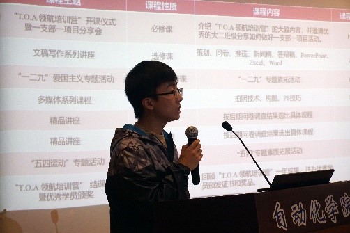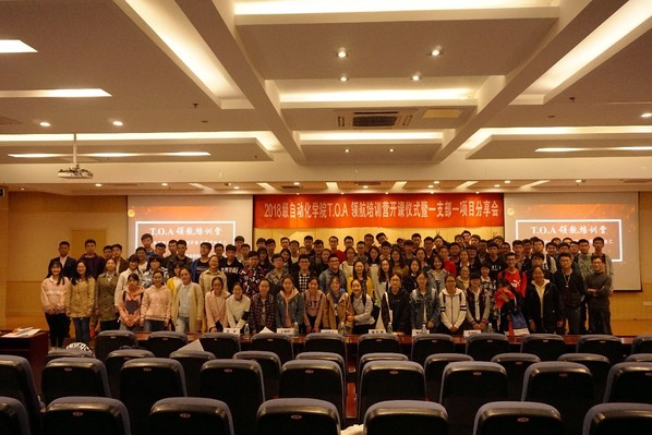 10月27日晚,自动化学院2018年度T.O.A领航培训营开课仪式暨一支部一项目分享会在自动化学院报告厅顺利举行。学院团委书记刘斐文,辅导员侯新闻、兴旺、汪明锐以及培训营全体学员参加了本次活动。