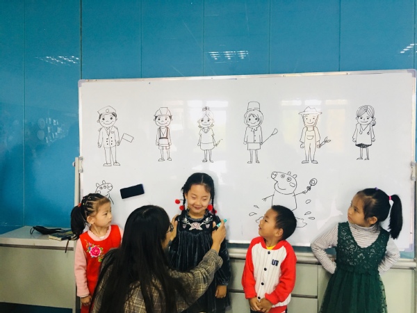 首先,杜木子同学和小朋友们一起画画,她先在小白板上画了几个不同的卡通形象,带着小孩子们一起“猜职业”。随后的画画互动环节,许多家长也参与其中,孩子们用彩笔画出了他们笔下的职业,并且写上了自己的名字。