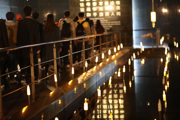在通往纪念馆的路两侧有联排的雕塑,雕刻着南京大屠杀中遇难者的形象。领着老母亲逃难的男子,抱着襁褓婴儿呼喊的母亲,搀扶着被日军欺凌的妻子的丈夫……这里的一草一木都好像在叙述曾经那段耻辱的历史。101位预科班同学井然有序地入馆参观。走进陈列馆首先映入眼帘的是一墙镌刻着死难者同胞名字的档案。这些名字将会被中华儿女永远铭记,300000这一惊人数目的震撼在这一刻让所有人肃然。陈列馆中还有当时记录大屠杀残忍现场的照片,烧杀抢掠的血腥事实已经不需要过多的字眼去描述。