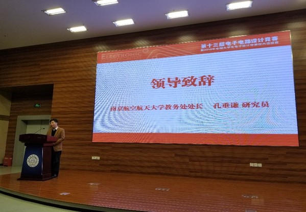 2018年11月12日晚,由自动化学院承办的“中航津电杯”第十三届电子电路设计竞赛,在将军路校区1号楼四楼报告厅举行试题发布会。解放军陆军工程大学潘克修教授、南京航空航天大学教务处处长孔垂谦研究员、自动化学院副院长王晓琳教授、自动化学院党委副书记张跃老师、自动化院团委书记刘斐文老师,以及各个参赛队伍的代表参加了本次发布会。