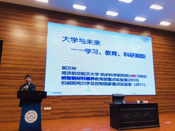 郭万林从“学习、教育、科学技术发展,纳米科技时代的革命性进展,智能科技时代的战鼓雷鸣,21世纪的科学愿景,大学梦一起实现”等五个篇章层层深入。郭万林首先对大学学习的重要性进行了阐述,他指出,大学是为了把普通学生教育成为有文化修养、具备优秀专业技能的人,使他们达到时代标准所要求的高度。学生在校期间在提高自身综合素养的同时,也要提升自身学习知识的能力,大一、大二基础课知识的掌握尤为关键。然后郭万林带领学生回顾和纵观科学的奥秘,从纳米技术的发展到人工智能时代的战鼓雷鸣,重点介绍了研究团队在水伏发电、碳材料研究的最新发现,“我们周围充满着能量,用蒸发发电不仅有望解决地球变暖的问题,还可以为污水处理提供一种新路径。” 他用通俗易懂的语言、深入浅出的解读,让学生们见识到科学的博大、科技的不可思议,也在同学们心底埋下一颗探究真理的种子。最后,郭万林细数所带的近百名硕博毕业生的发展方向与职业选择,引导同学们认识专业发展的无限可能。