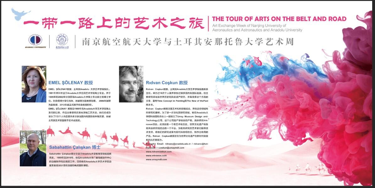 11月12日-11月21日,土耳其安那托鲁大学(Anadolu University)艺术学院院长EMEL ŞÖLENAY 教授和Rıdvan Coşkun教授、Sabahattin Çalışkan博士、安纳托鲁大学对外联络部主任冯莉莉一行,受邀来校开展学术访问交流,并联合我校艺术学院举办“一带一路上的艺术之旅”交流周活动。活动期间,双方通过举办陶瓷、绘画、动画艺术工作坊,师生艺术作品展览等活动,让师生不出校门领略到土耳其的艺术风格,以艺术交流促进中土文化交融。