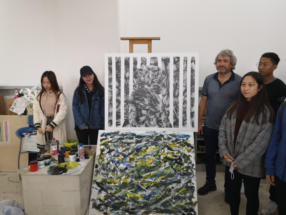 绘画工作坊由Ridvan Coskun教授担任主讲,他向同学们讲授了土耳其绘画艺术,展示了绘画方面的新材料、新技法、新理念,并现场作画。笔刷蘸着五彩缤纷的颜料粉,在画板上快速绘画,随着色彩的晕染,独特的画面逐渐形成,十分精致细腻。教授所带来的这些富有创意的绘画手法,让学生们大开眼界,收益颇丰。