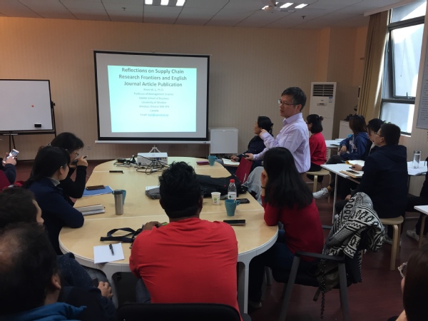 在学术交流活动中,李武教授首先介绍了供应链管理研究的前沿现状,指出将企业社会责任、环境责任以及不同的非经济偏好纳入可持续供应链管理。李武教授通过自身对十余家国际SCI/SSCI期刊发表以及审稿经验的反思,就论文的写作提出了诸多建议。