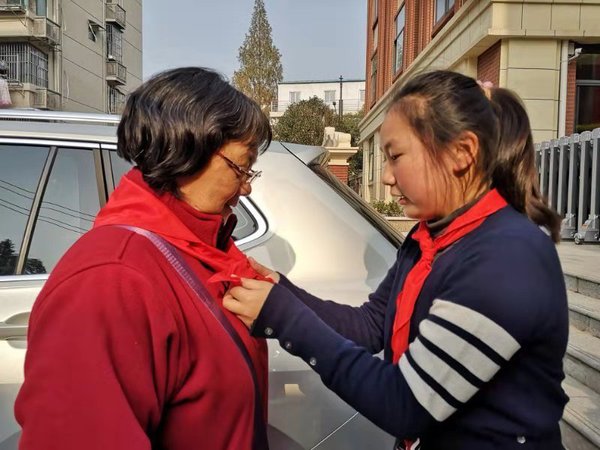 老同志们一进校园,少先队员列队为老同志们一一戴上鲜艳的红领巾,敬少先队队礼,表达了对爷爷奶奶的敬意和立志成长成才的决心。