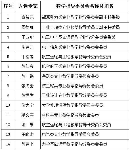 日前,教育部召开了2018-2022年教育部高等学校教学指导委员会成立大会,公布了新一届教学指导委员会委员名单,我校14位专家入选。其中,9位专家继续担任本届委员,5位专家为新增委员。能源与动力学院宣益民院士为上届能源动力类专业教学指导委员会委员,现担任该委员会副主任委员,经济与管理学院院长周德群继续担任工业工程类专业教学指导委员会副主任委员。王成华、周建江、丁松滨、陈仁良、陈谋、张海黔、陈炳发继续担任本届教指委委员,施大宁、梁文萍、陈果、王晓琳、陈建平为本届教指委新增委员。