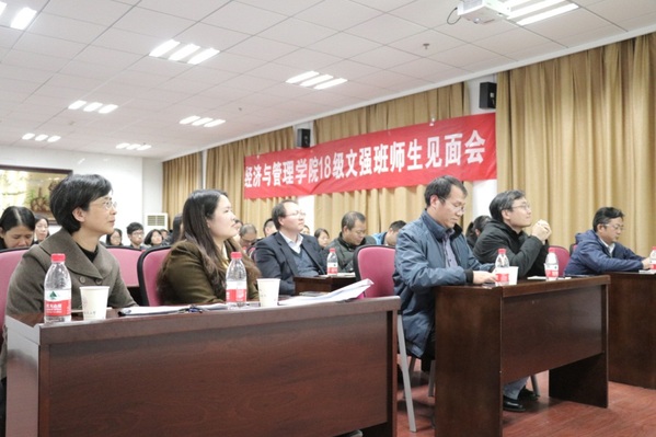 11月28日下午,经济与管理学院召开18级文科基础强化班师生见面会,学院院长周德群,副院长邓晶、王英、王子龙,党委副书记涂志宏及文强班的班主任、近20位导师共同参加了本次见面会。