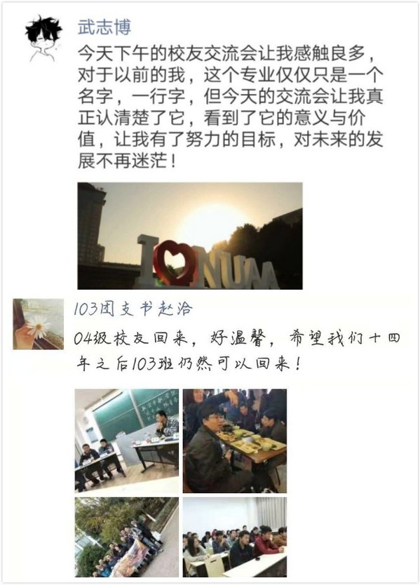 校友们言语中非常自豪,在南航的四年里他们学到了很多受益终生的知识,并且就业之后也因为南航毕业生的身份而被重用。新生们纷纷表示经过此次校友交流会,对专业有了更深入的了解,在当下的专业迷茫中看到了自己应该努力前进的方向,更感动于师兄师姐的母校情、同学情。