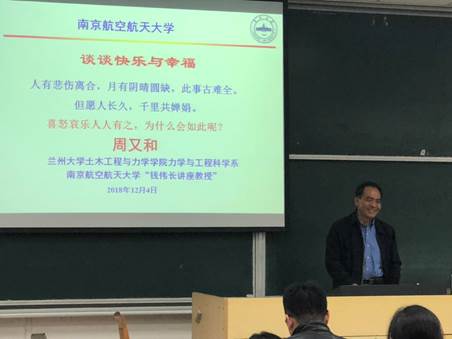 12月4日,“航宇大讲堂”之“谈谈快乐与幸福”讲座在将军路校区6号教学楼6203教室举行。国家教学名师、南京航空航天大学“钱伟长讲座教授”、兰州大学土木工程与力学学院周又和教授就这一主题进行了两小时的演讲,为同学们带来一场别开生面的讲座,以工科人的角度与同学们共议何为快乐与幸福。