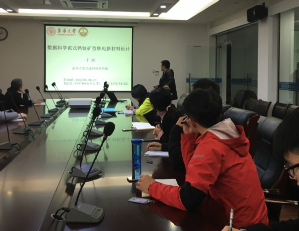 报告介绍了“材料科学的系统工程:科学研究范式”、“压电陶瓷材料的发展趋势”以及“数据挖掘与铁电陶瓷新材料设计实践”;此外,于剑还就科研思维的培养、在铁电压电陶瓷新材料课题中的应用及其最新课题成果进行了深入交流。与会同学反馈“很受启发,像开启了一扇新的窗户”。于剑与航空宇航学院朱孔军教授就数据挖掘思维在铁电压电陶瓷材料中的应用进行了探讨,数据挖掘思维为朱孔军教授课题组目前进行的压电复合材料、储能材料等课题的研究带来了新的研究视角。