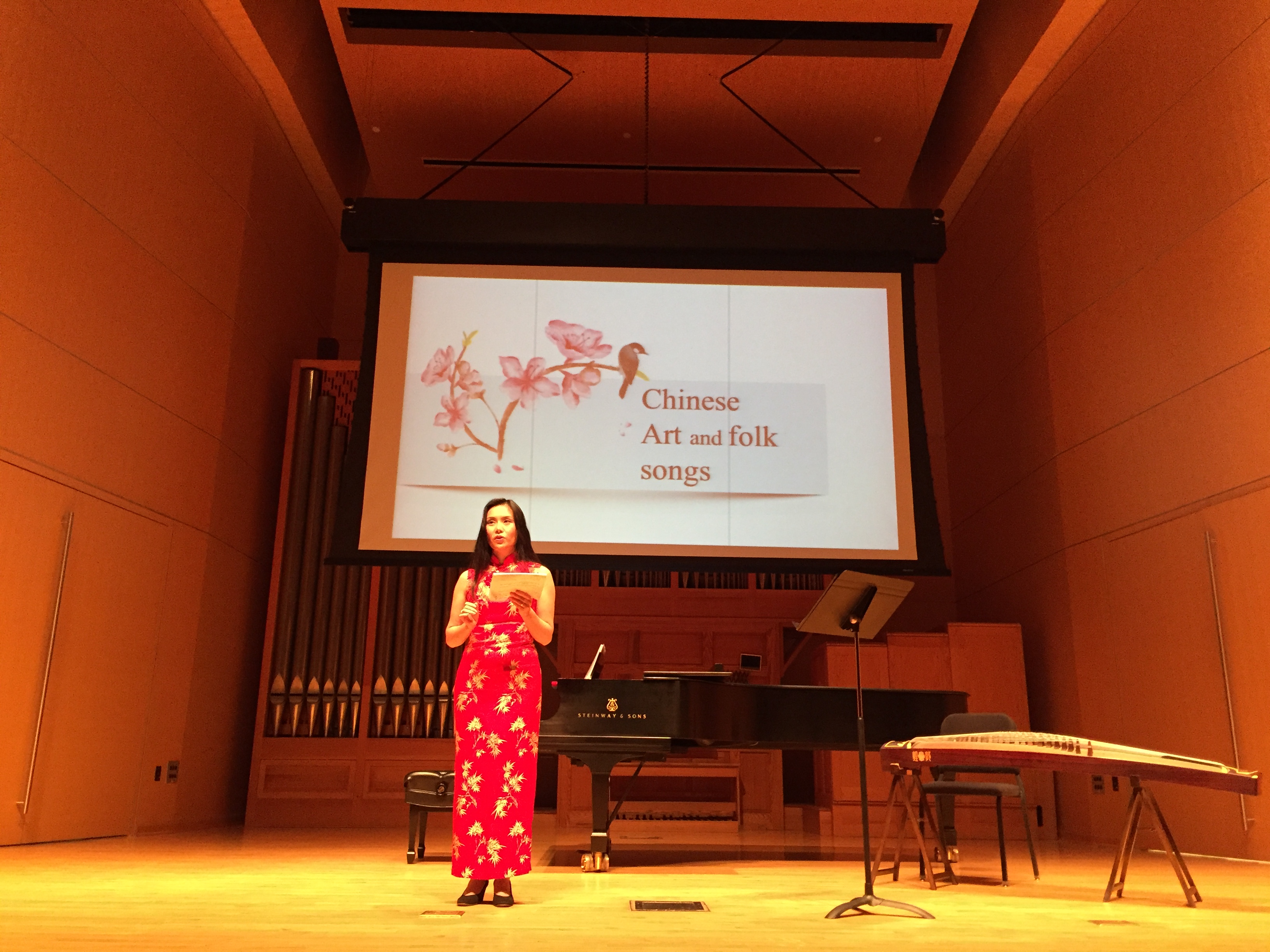 音乐会在江苏民歌《茉莉花》的背景音乐中拉开序幕。张进老师一袭红色旗袍走入舞台,神采奕奕,声情并茂,娓娓道来。她向观众们介绍了具代表性的中国艺术歌曲及其表达的传统文化内涵,以及中华民族的民族区域分布和各地民间音乐特质,她解读了新疆地区哈萨克民歌《燕子》、维吾尔族民歌《阿拉木汗》、江苏民歌《茉莉花》等具有鲜明地方色彩的民歌的曲调特色、文化意蕴,使观众们对中国民歌有了初步的认识。