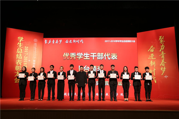 表彰大会以“聚力青春梦 奋进新时代”为主题,通过“知行合一新青年”“开拓进取新画卷”“求真务实新作为”“砥砺奋进新气象”“ 立德树人新征程 ” 五个篇章节展示了我院学生一年来的成长与收获。在“知行合一新青年”篇章,来自2016级艺术设计专业的张钦智同学代表“校友会奖学金”获得者发言,她讲述了自己在优秀学长影响下,如何内心于心外化于行,追求进步,不仅学业成绩优秀,更是作为我院青协负责人,把志愿服务工作做成品牌,用奋斗的青春燃烧光和热来照亮学弟学妹前进的脚步。在“开拓进取新画卷”篇章充分展示各单位利用自身特色资源,为学生提供良好的展示平台,保障了技能大赛取得圆满成功。各技能培养单位代表介绍了本单位在学生技能培养方面取得的成绩。充分诠释出学院始终秉承着技能加学历的办学理念,一贯坚持“一体两翼”人才培养目标,重视学生技能的培养。在今年的技能大赛中,我们共有117名同学受到表彰。他们从兴趣里汲取力量,从技能学习中收获成功。在“求真务实新作为”中,优秀学生干部代表陈佳俊同学就四年“勤于治学,无私付出,用心奉献,用爱服务”来分享了他在学习、工作中的大学历程,用实际行动诠释了他们不辞辛苦,自强不息,挑战自我,关爱同学,热爱集体;不计得失。充分激励所有学生追求卓越、蓬勃向上。在“砥砺奋进新气象”篇章中,优秀团队代表墨韵礼仪队的团结奋进,敢于创新的团队文化,体现了我院学生组织的不断奋斗,开拓创新的新气象;标兵班级代表CZ04150301班的团结奋斗,勇于创新的班级体。以勤奋诠释追求,用团结描绘梦想。是他们用实际行动诠释了榜样的力量和集体前行的方向。在“立德树人新征程”篇章中优秀教师代表王玉鹏老师上台分享三尺讲台,两尺教鞭,挥洒着他们无悔的人生。在平凡的岗位上,呕心沥血,默默奉献,践行着对教育事业的无限责任和忠诚,承载着时代重任。