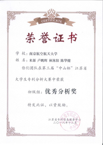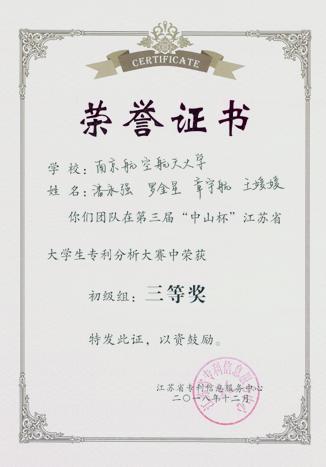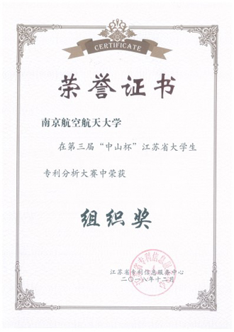12月7日,第三届江苏省“中山杯”大学生专利分析大赛决赛在南京理工大学落下帷幕,由我校图书馆、专利基地和知识产权信息服务中心指导的潘永强团队荣获初级组三等奖、米源团队荣获初级组优秀分析奖,我校荣获组织奖。这是我校学子继第二届“中山杯”江苏省大学生专利分析大赛荣获初级组最佳检索奖2项、初级组最佳分析奖2项、我校荣获最佳组织奖后,再次取得优异成绩!