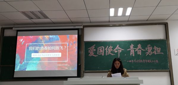 随后,1118101班汤思雨结合文化自信为我们讲述了一堂鲜活的艺术课,主题为“艺术——文化自信承载中国梦”。贤人古训,句句箴言深入心中,让文化艺术与中国梦紧紧相连;1118401班李海洁为我们讲述了 “我们的青春如何放飞”,我们正值青春年少,如何放飞自己的梦想?青春翱翔,我们既要有仰望星空的理想,也要有脚踏实地的毅力;因为梦在远方,而路,在脚下。
