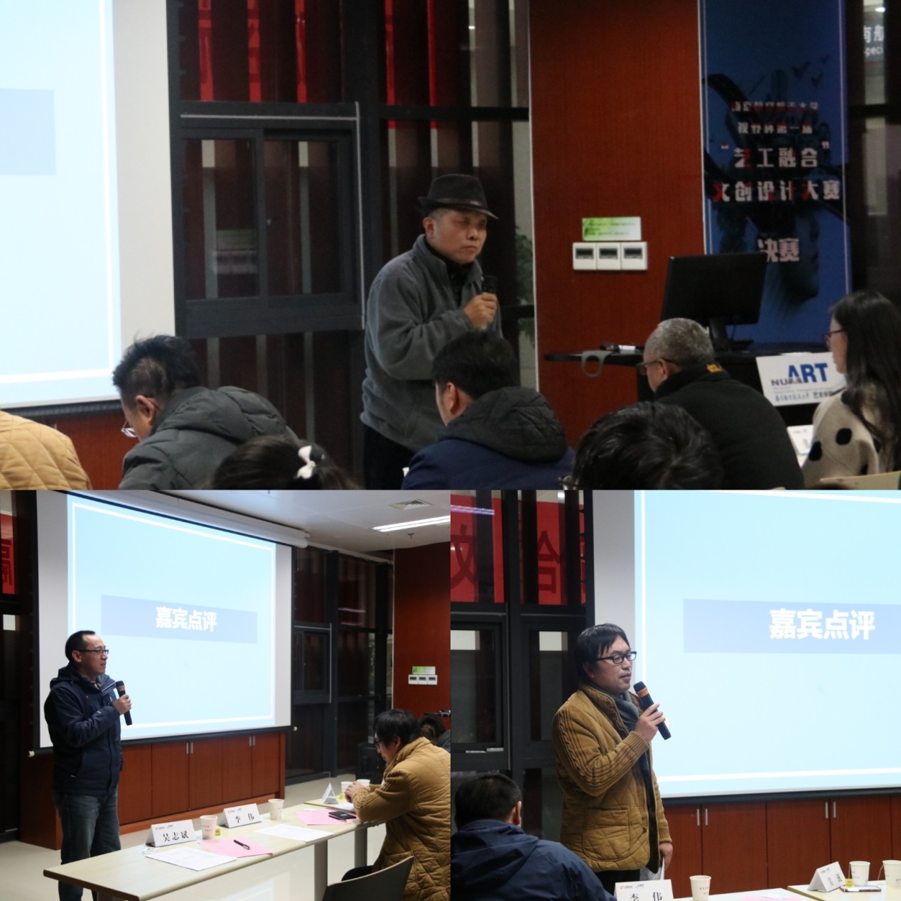 答辩结束后,由三位老师分别对各类别的作品表现做出点评。机电学院工业设计专业教师吴讯对平面设计类和文创实物类的作品进行点评,他表示这次比赛让他有很多收获,他看到各专业的同学勇于创新,融合艺工的精神,他说“蓝龙flying团队的磁悬浮技术,能够基于反扭矩实现360度自转,这就是一种创新的想法”。在对数字多媒体类作品的点评中,艺术学院广播电视学专业教师吴志斌表示,三组作品的设计都给他留下很深的印象,也存在一定的提升空间,希望同学们能够通过本次比赛带来视频制作方面的突破。最后,国家一级舞美师、艺术学院美术专业教师王立庆对舞美设计类的作品进行点评,他表示“做出一个完整的舞美设计作品,需要耗费大量的时间和精力,尤其PM2.5十佳歌手的作品,在全面性方面做得特别好。”