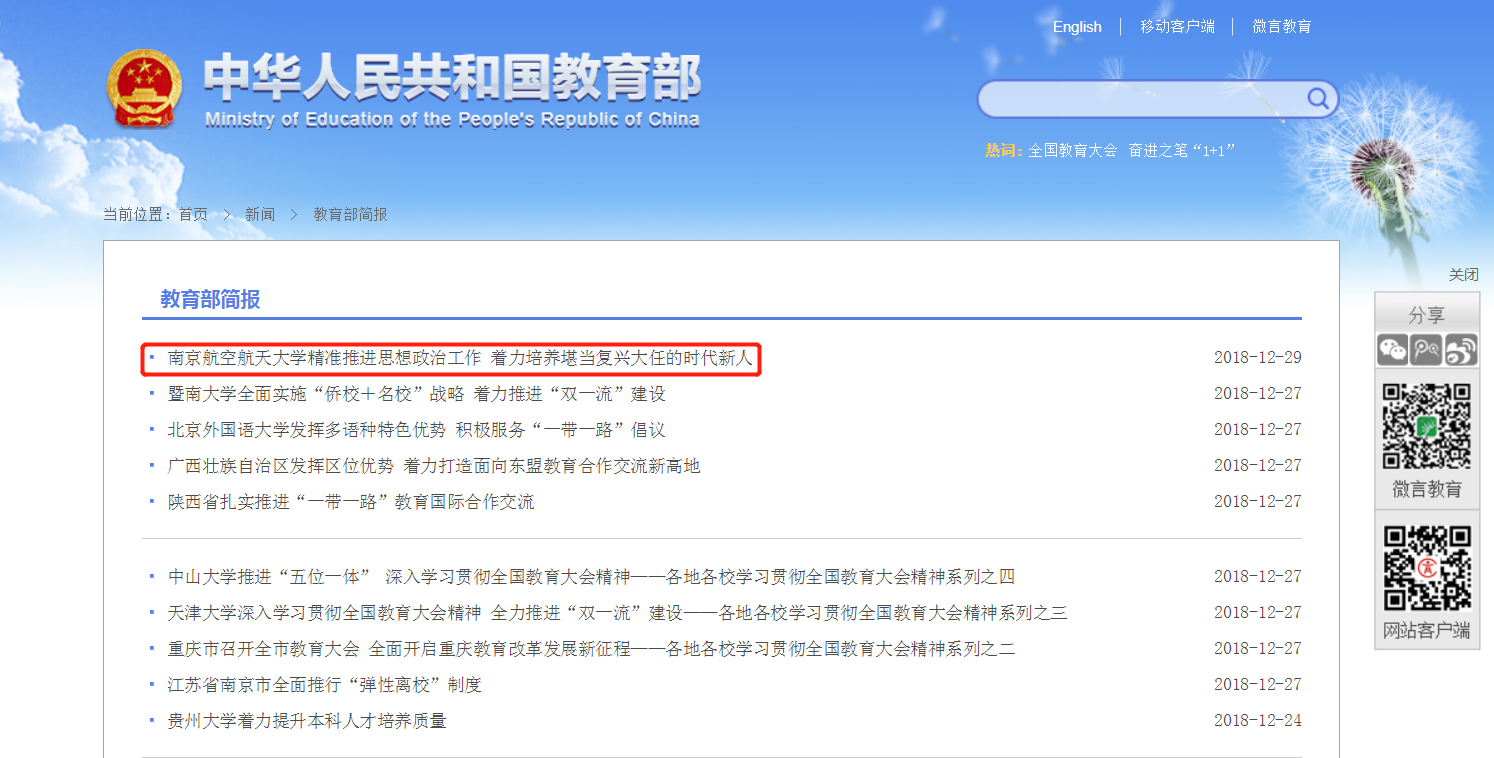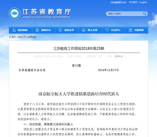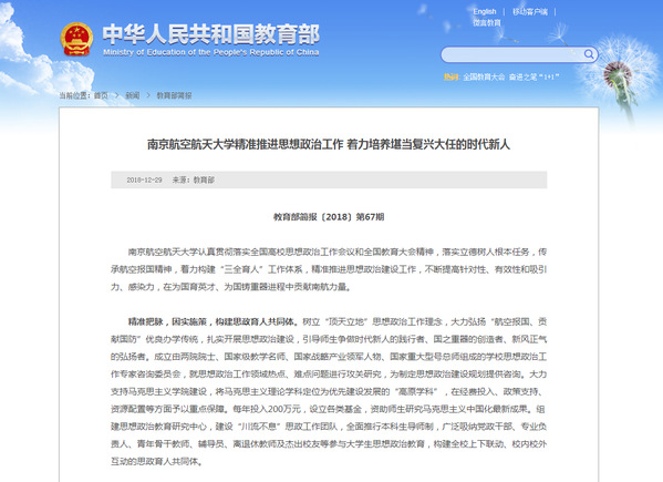 近日,教育部简报〔2018〕第67期以《南京航空航天大学精准推进思想政治工作 着力培养堪当复兴大任的时代新人》为题,刊发我校贯彻落实全国高校思想政治工作会议和全国教育大会精神,落实立德树人根本任务,传承航空报国精神,精准推进思想政治建设工作的工作经验。此前,在江苏教育厅主办的江苏教育工作简报(2018年第25期)中,以《南京航空航天大学推进精准思政培育时代新人》为题,报道了我校扎实推进精准思政工作的经验做法。